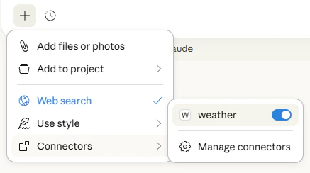 让我们确保 Desktop 版的 Claude 能够正确识别我们在weather 服务器中暴露的两个工具。你可以通过查看“添加文件、连接器和更多 /”